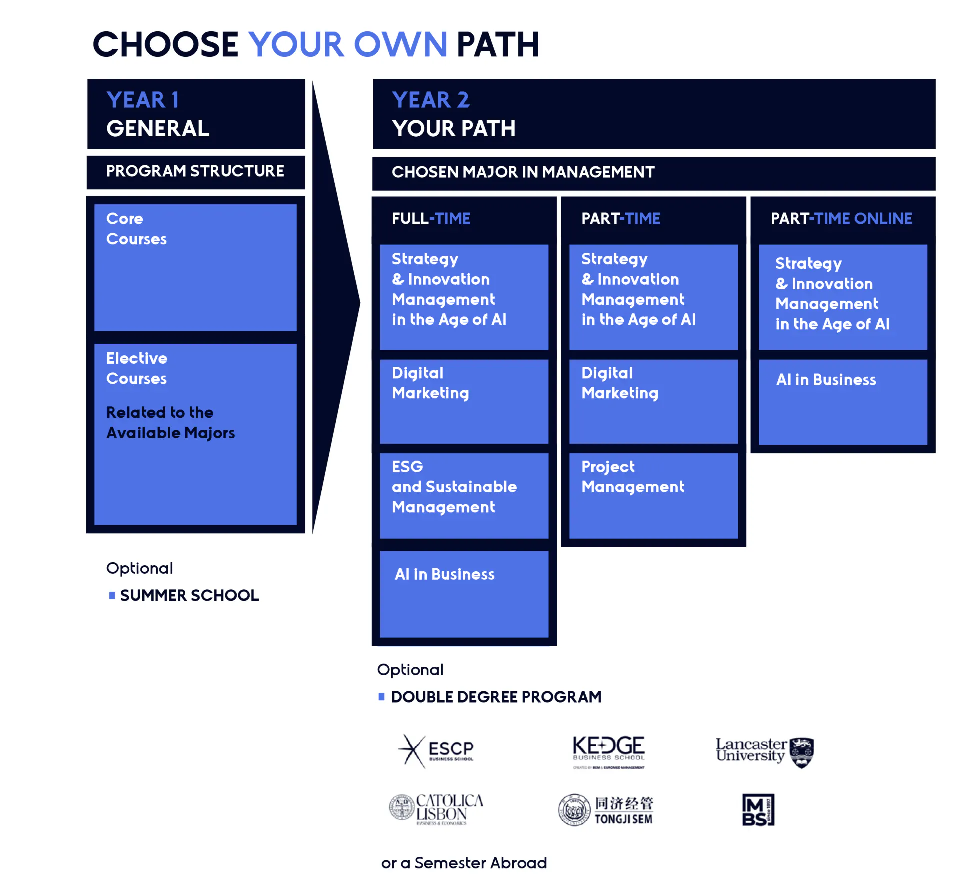 - Two diplomas from leading European universities, same workload, no extra tuition fees.